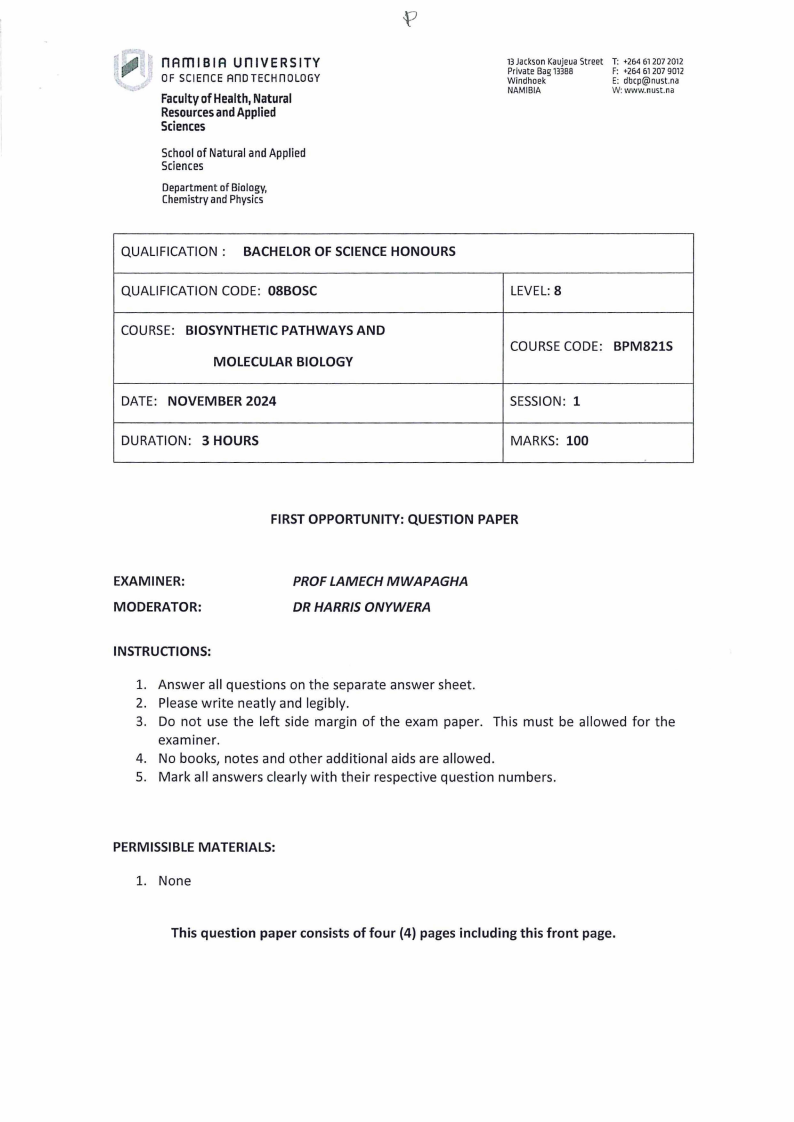 Biosynthetic Pathways and Molecular Biology (BPM821S) ist Opportunity November 2024