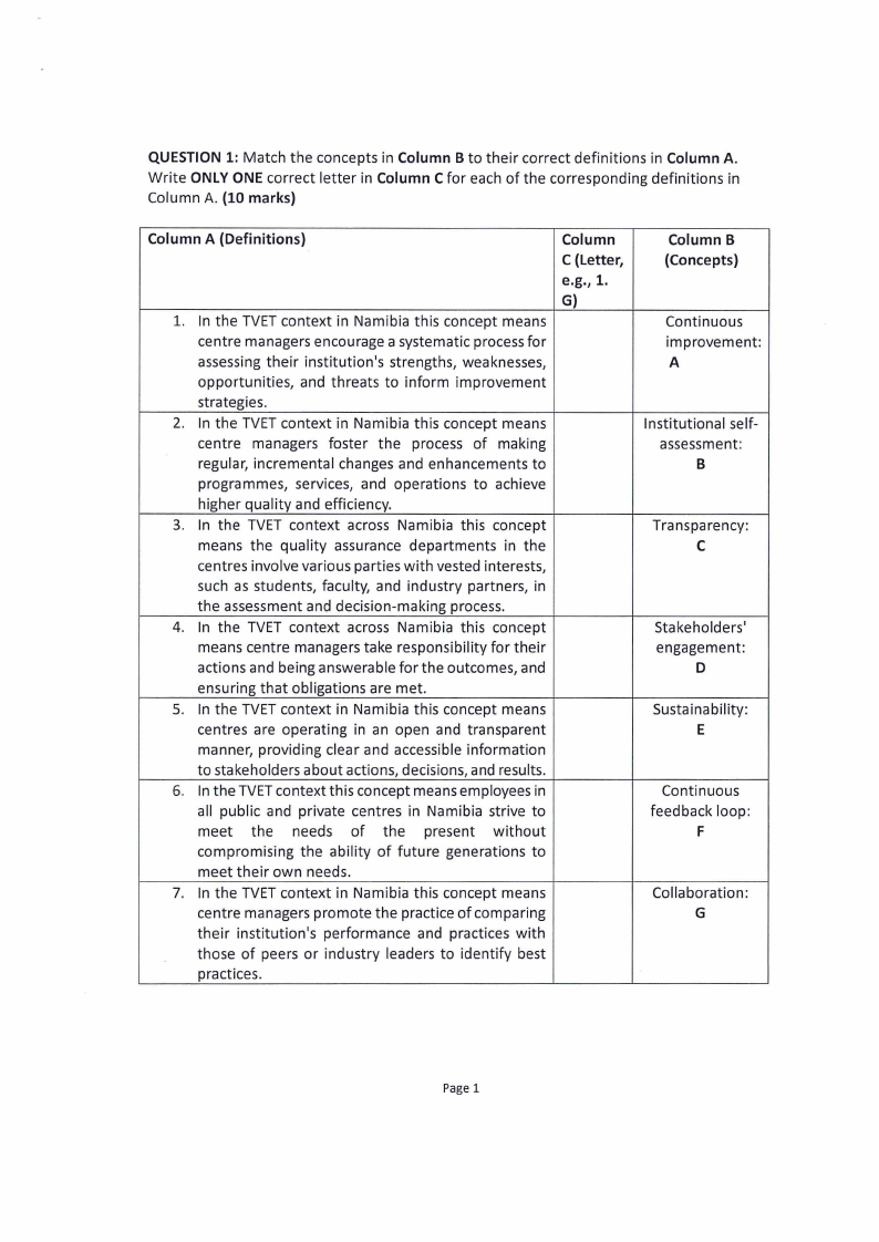 QUESTION 1: Match the concepts in Column B to their correct definitions in Column A.