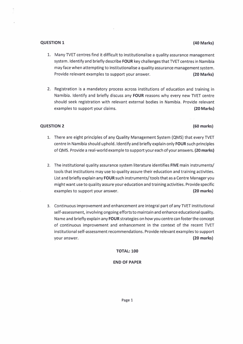1. Many TVETcentres find it difficult to institutionalise a quality assurance management
