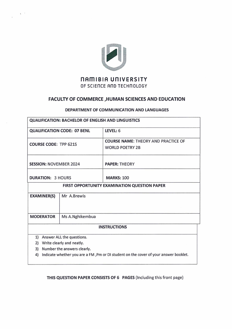 TPP - THEORY AND PRACTICE OF WORLD POETRY 2B - 1ST OPP - NOV 2024 |