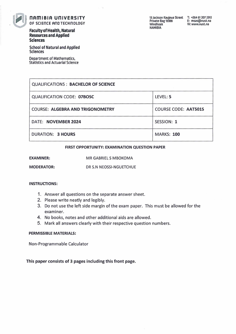 COURSE: ALGEBRA AND TRIGONOMETRY