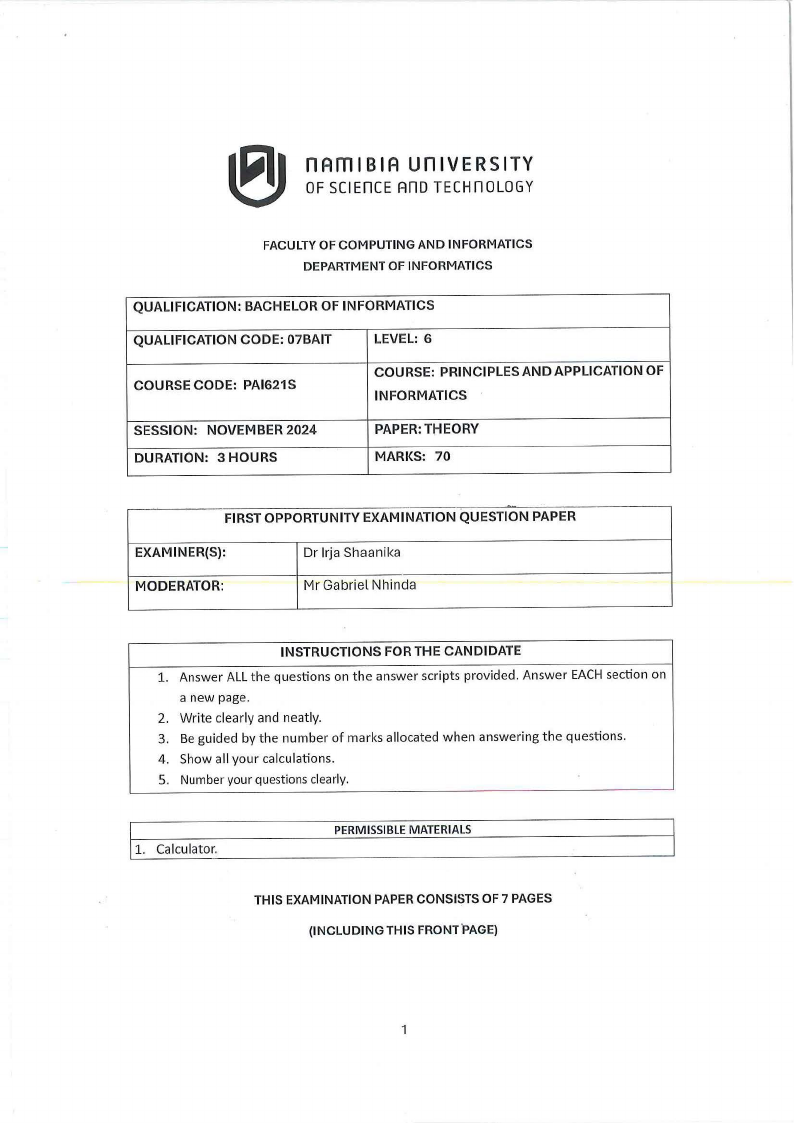 PAI621S - PRINCIPLES AND APPLICATION OF INFORMATICS - 1ST OPP - NOV 2024 |