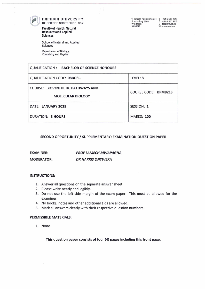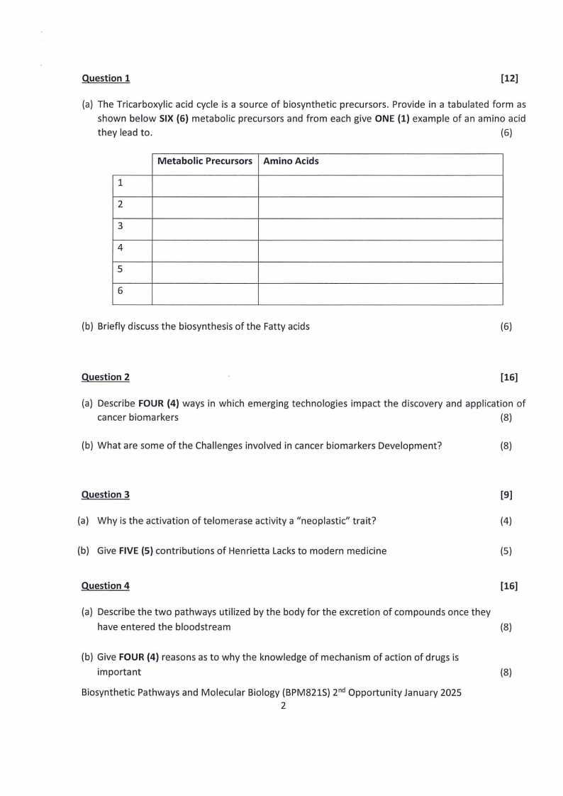 Biosynthetic Pathways and Molecular Biology (BPM821S) 2nd Opportunity January 2025