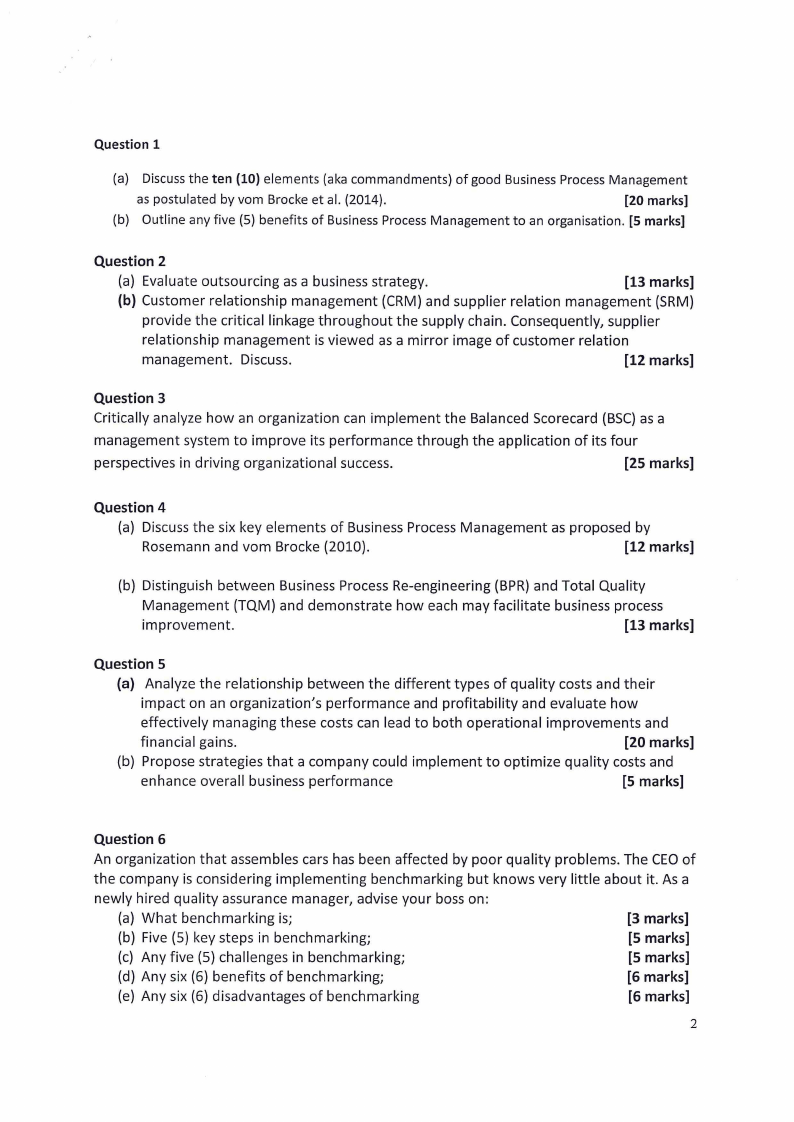 (b) Outline any five (5) benefits of Business Process Management to an organisation. [5 marks]