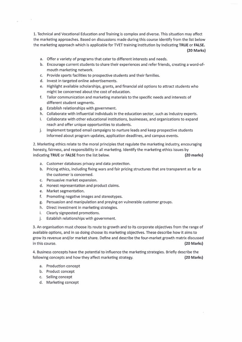 the marketing approach which is applicable for TVETtraining institution by Indicating TRUE or FALSE.
