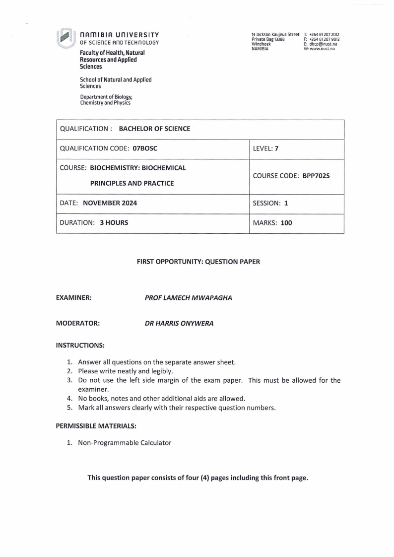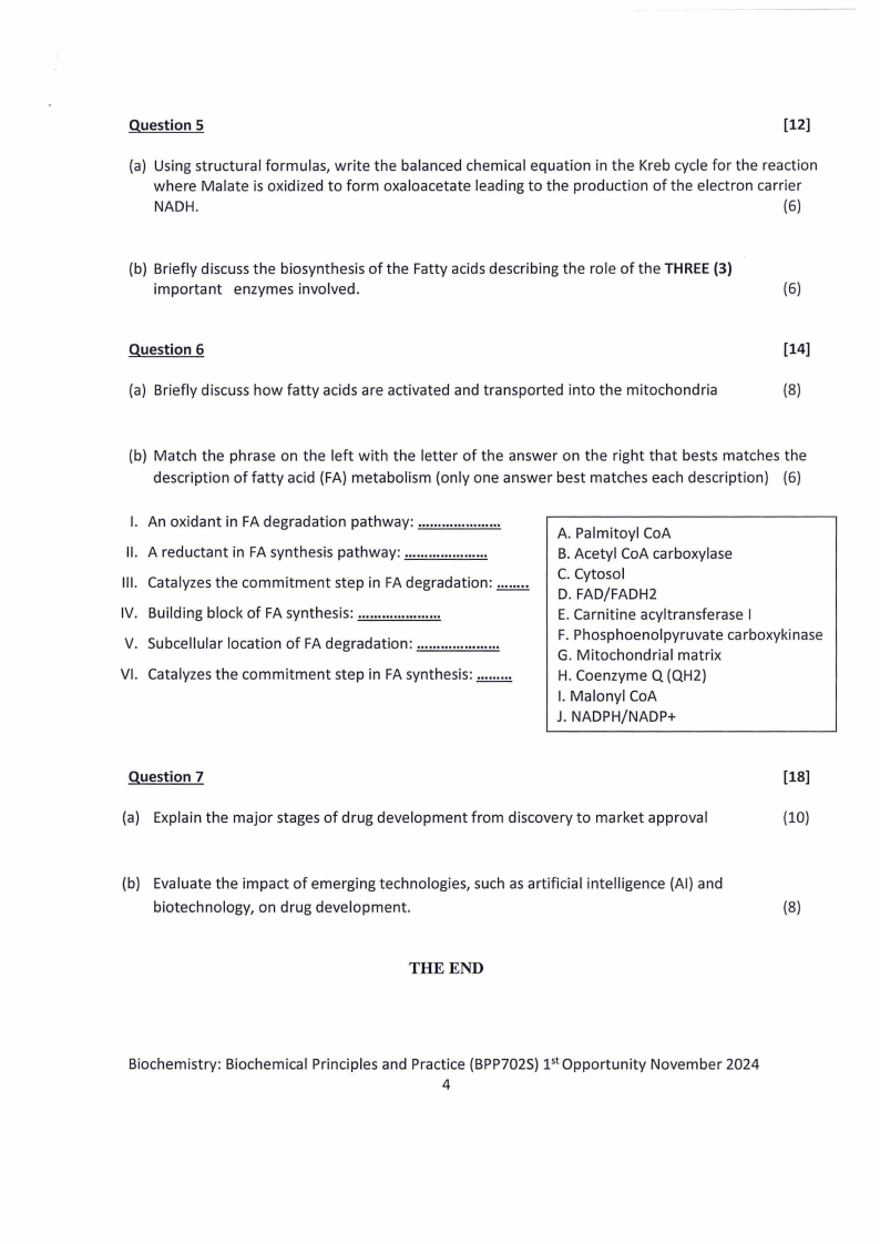 Biochemistry: Biochemical Principles and Practice (BPP702S) pt Opportunity November 2024