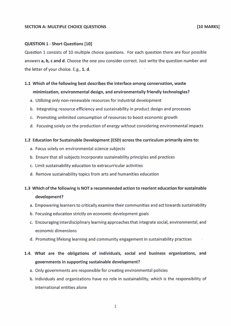 Question 1 consists of 10 multiple choice questions. For each question there are four possible
