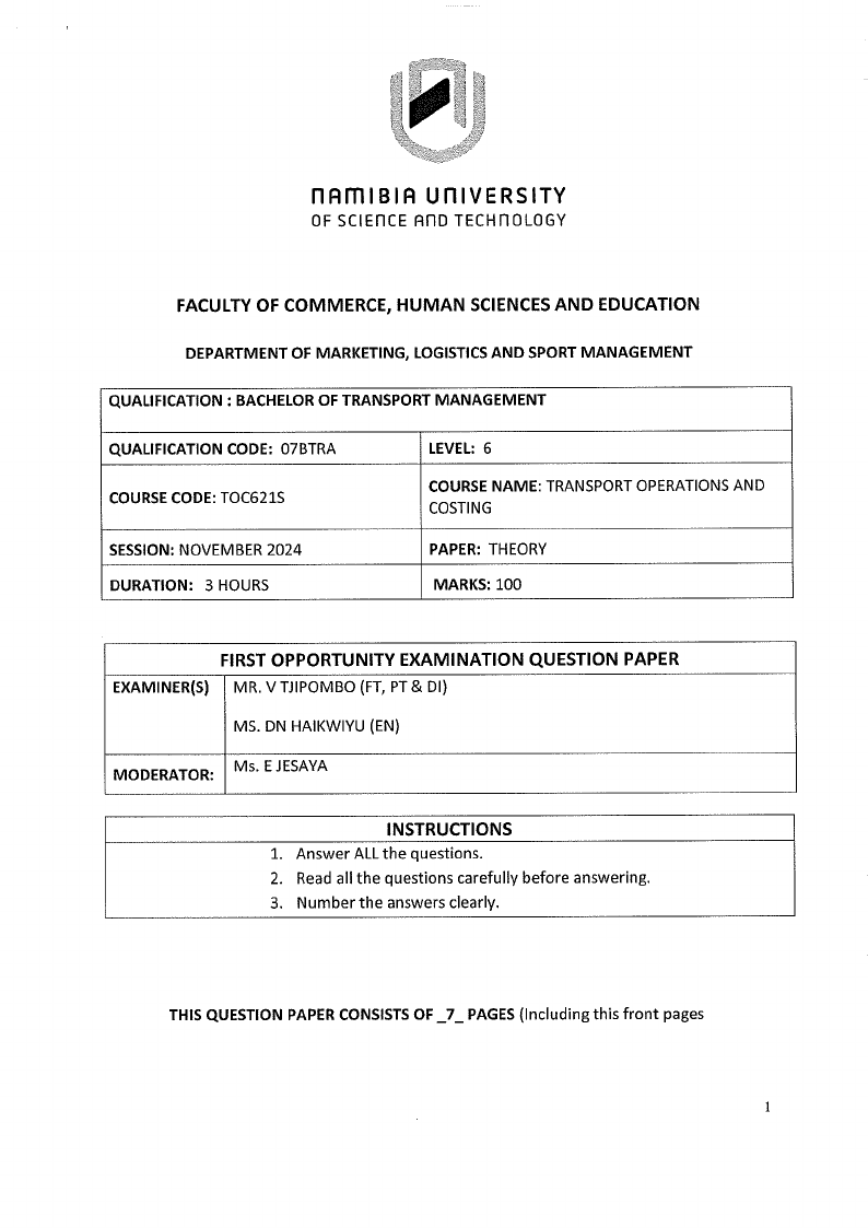 TOC621S - TRANSPORT OPERATIONS AND COSTING - 1ST OPP - NOVEMBER 2024 |