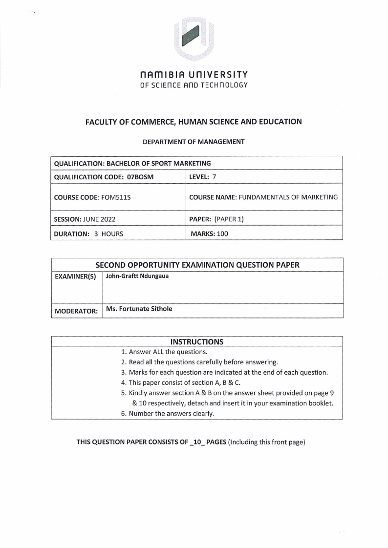 FOM511S - FUNDAMENTALS OF MARKETING - 2ND OPP - JULY 2022 |