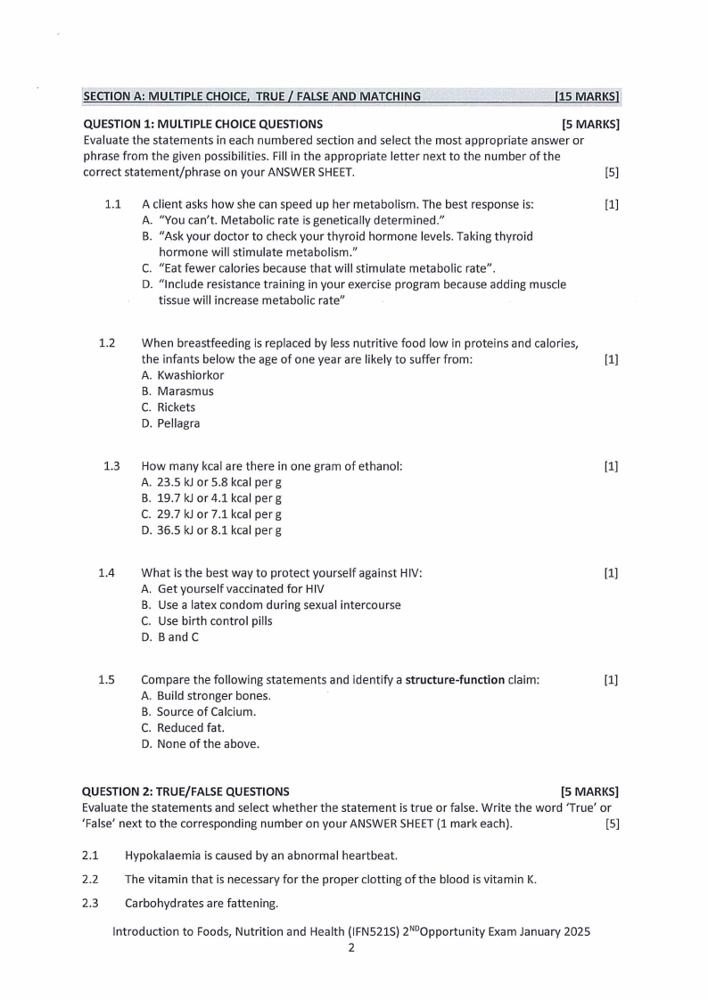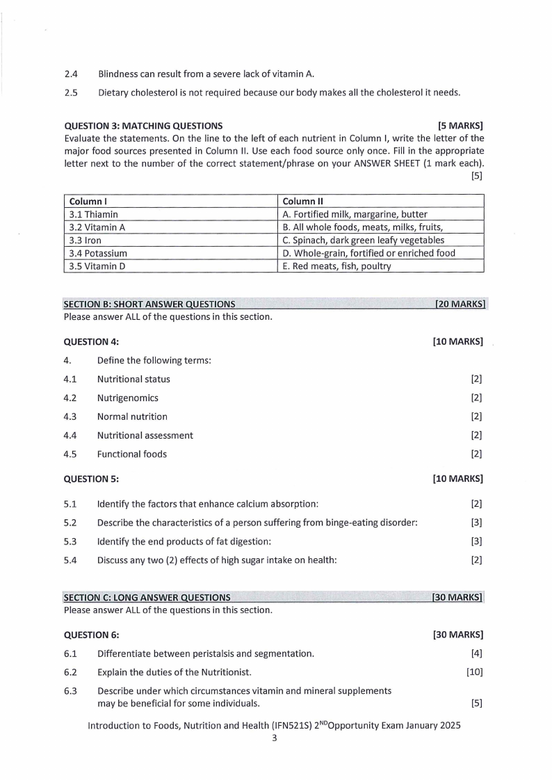 Introduction to Foods, Nutrition and Health (IFN521S)2N°Opportunity ExamJanuary 2025