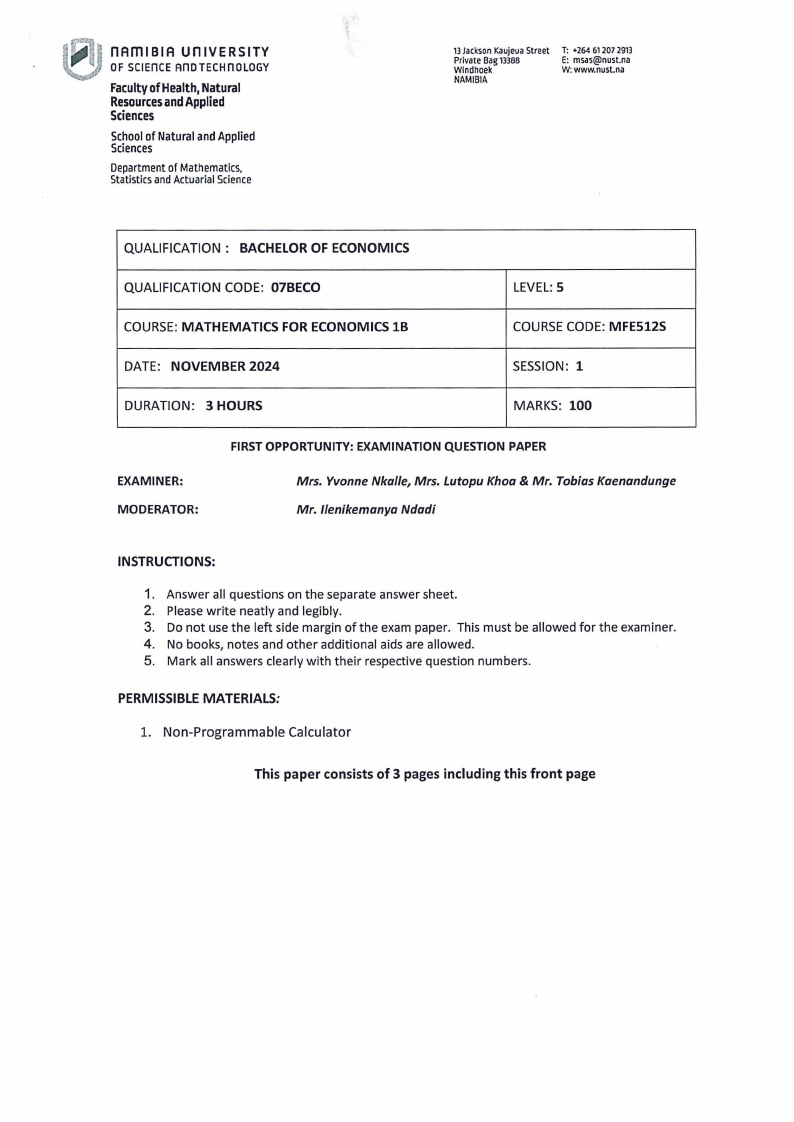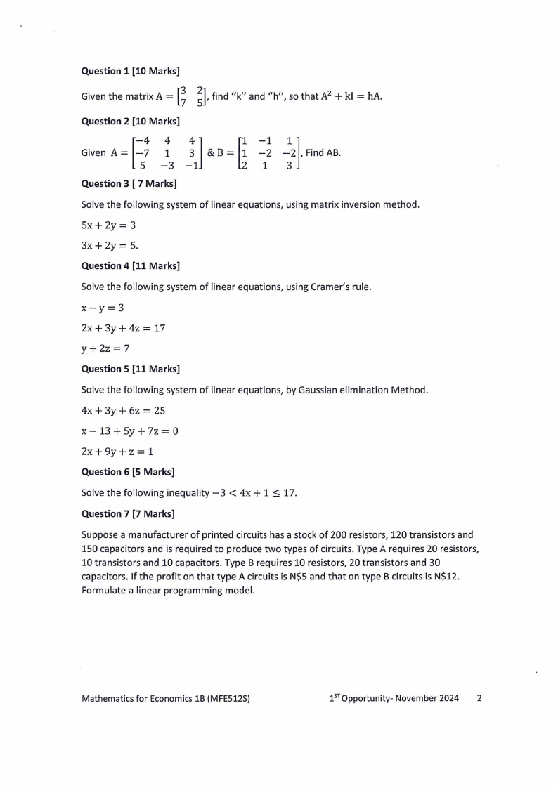 Mathematics for Economics 1B (MFE5125)