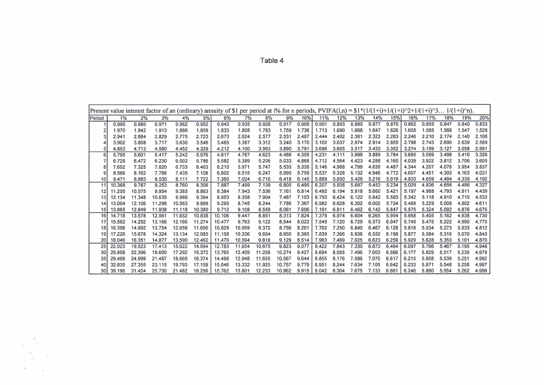 Present value interest factor of an (ordinary) annuity of $1 per period at i% for n periods, PVIF A(i,n) = $1 *(1/(1 +i)+ 1/(1+i)1'2+ 1/(1+i)1'3... 1/(1+i)"n).