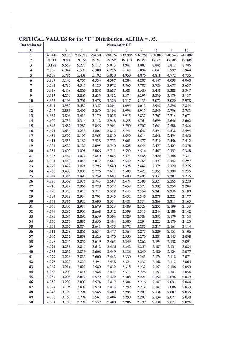 CRITICAL VALUES for the "F" Distribution, ALPHA = .05.