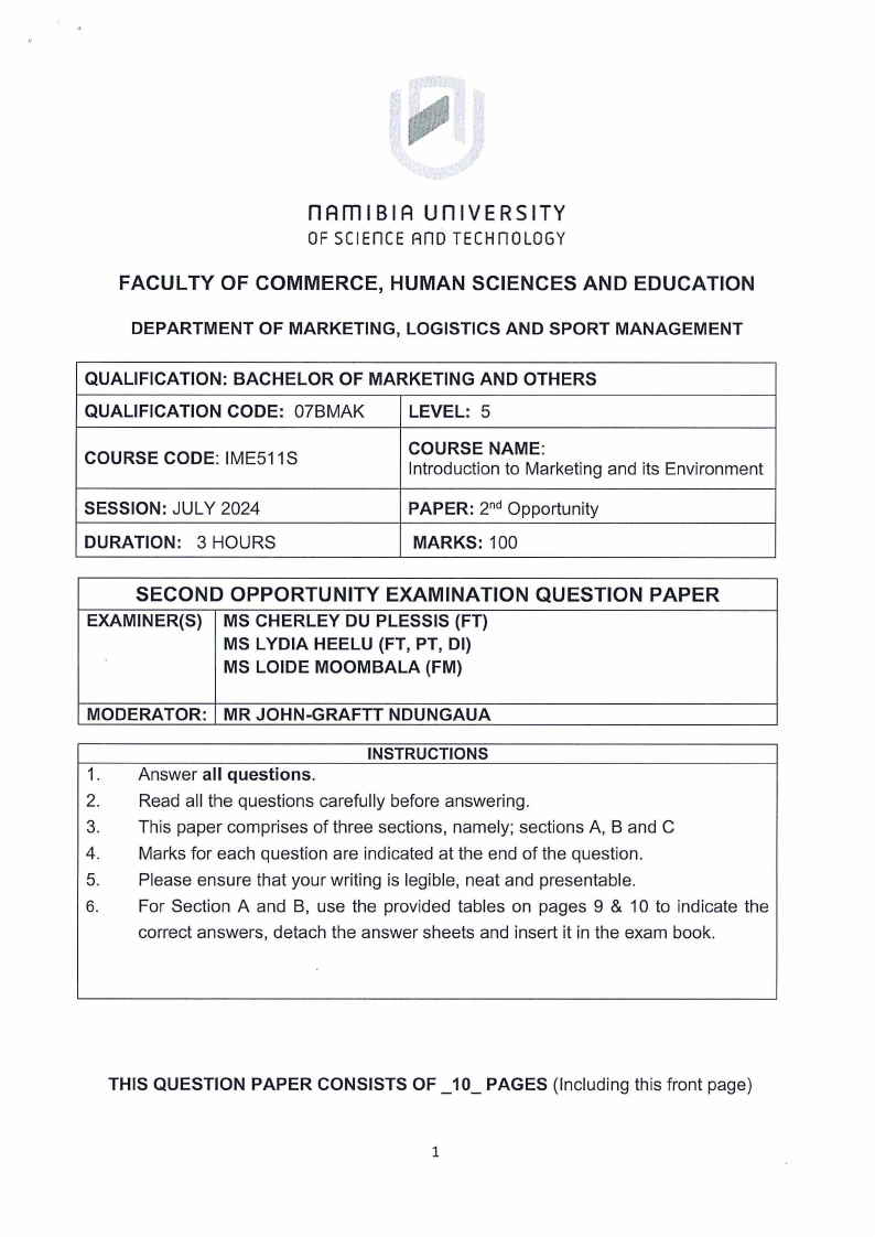 IME511S- INTRODUCTION TO MARKETING AND ITS ENVIRONMENT- 2ND OPP- JULY 2024 |