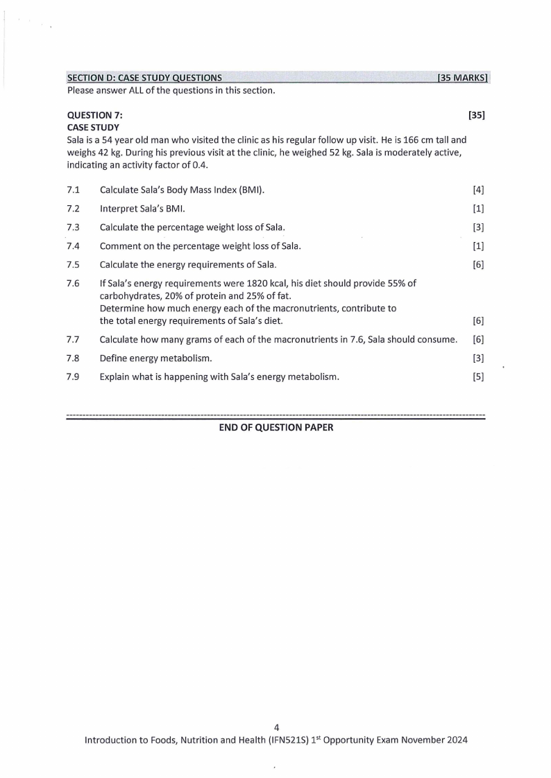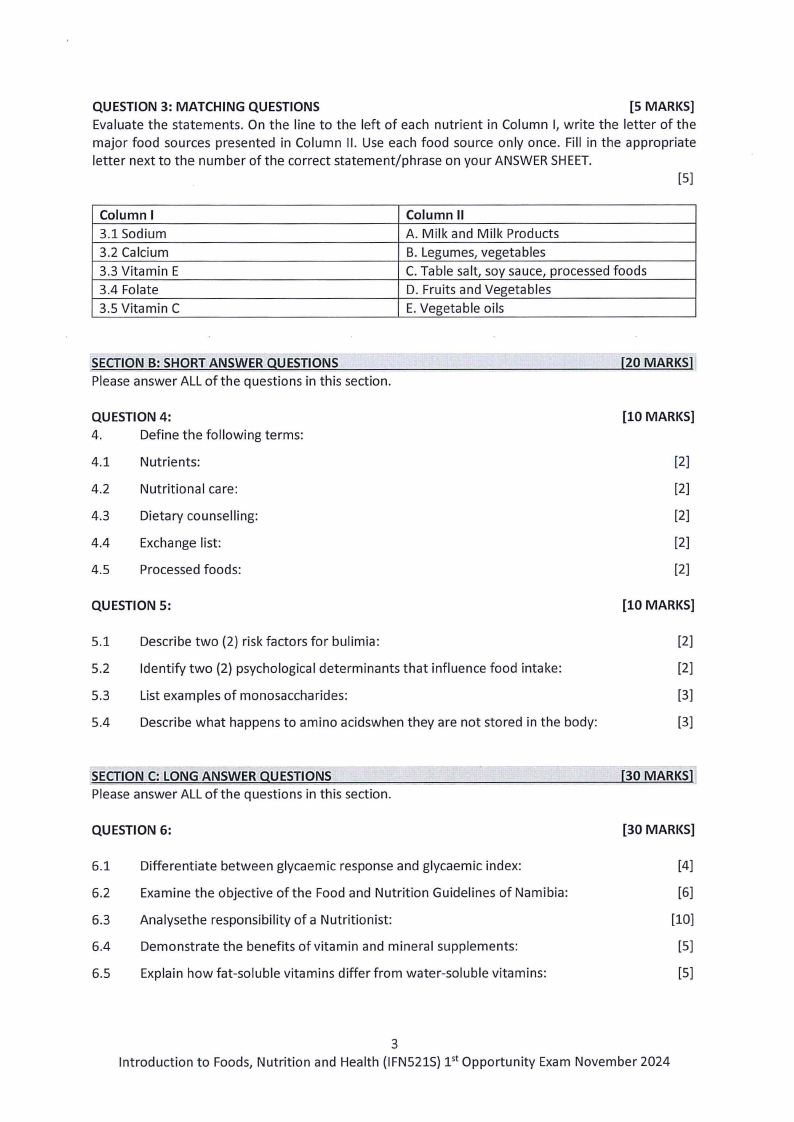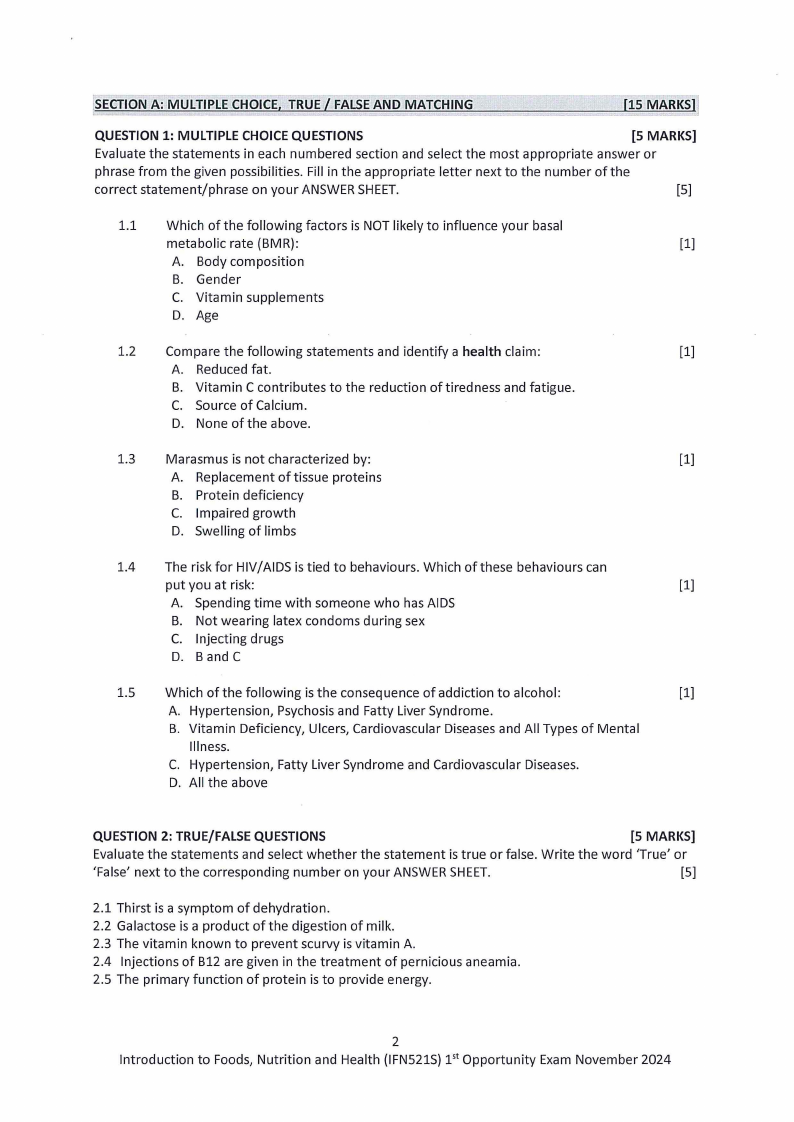 Introduction to Foods, Nutrition and Health (IFN521S) 1st Opportunity Exam November 2024