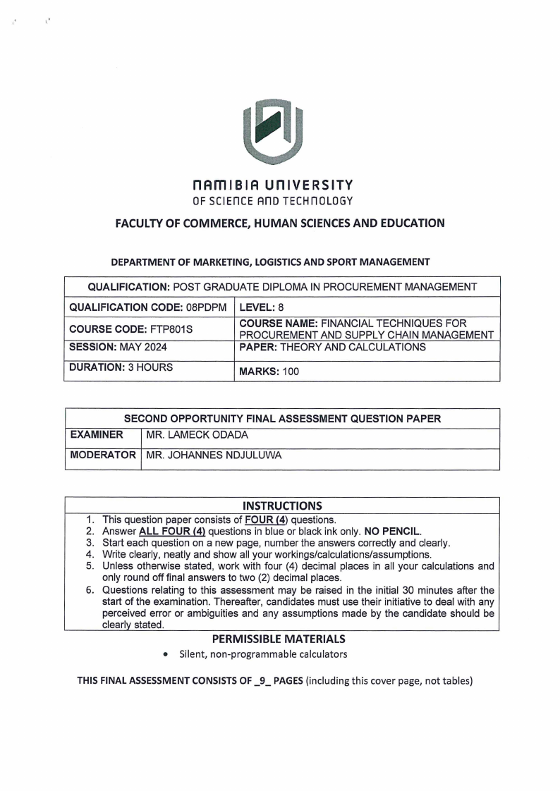 FTP801S- FINANCIAL TECNIQUES FOR PROCUREMENT AND SUPPLY CHAIN MANAGEMENT- 2ND OPP- JULY 2024 |
