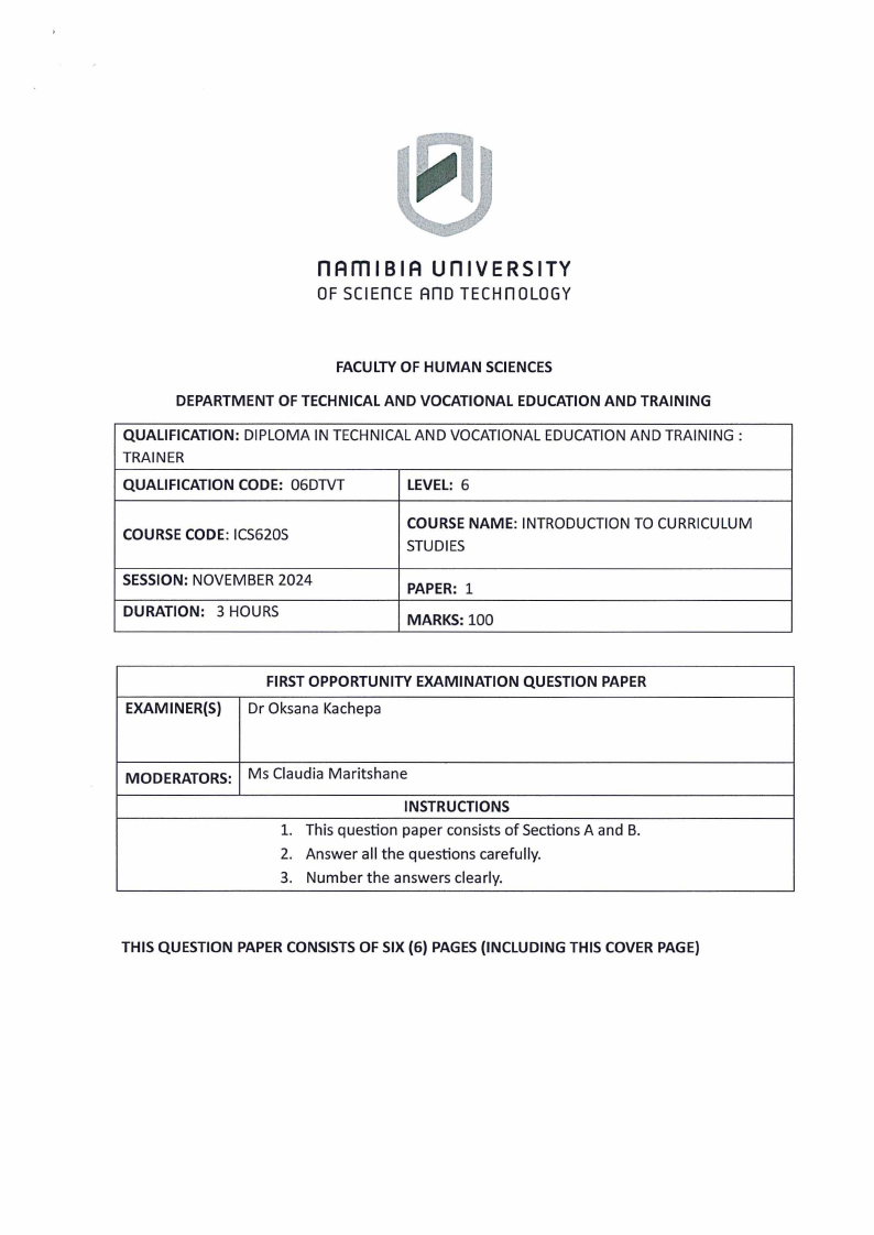Charter as Namibia's TVETcurriculum is intended to contribute to society, the economy,
