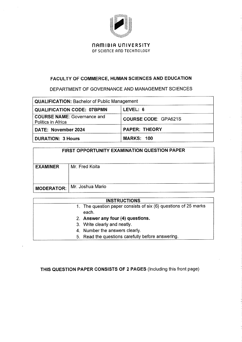 FIRST OPPORTUNITY EXAMINATION QUESTION PAPER