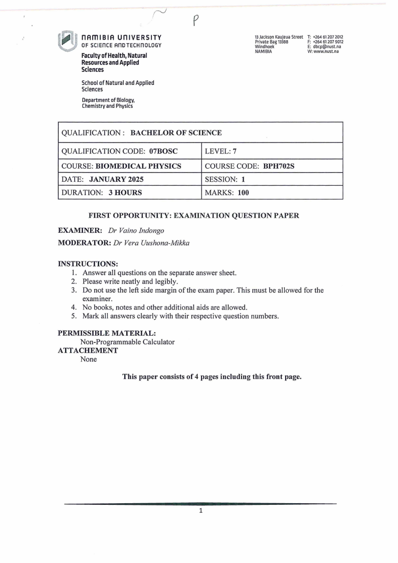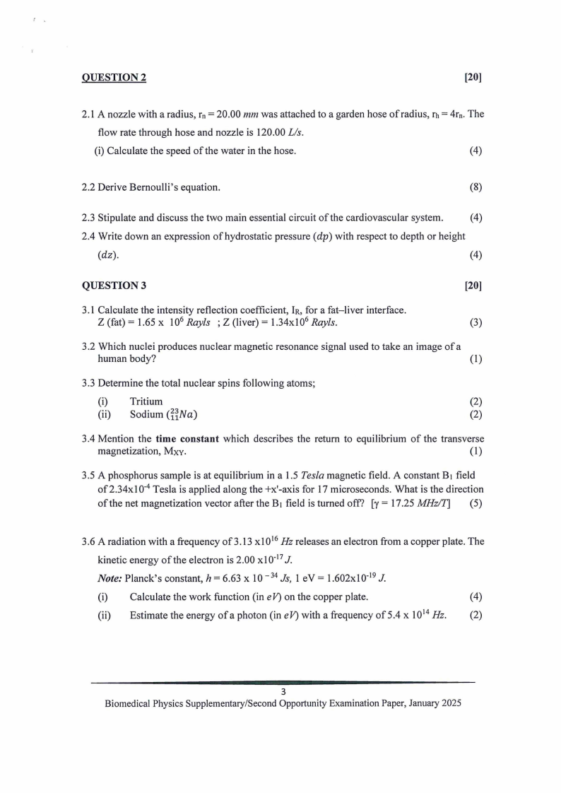 Biomedical Physics Supplementary/Second Opportunity Examination Paper, January 2025