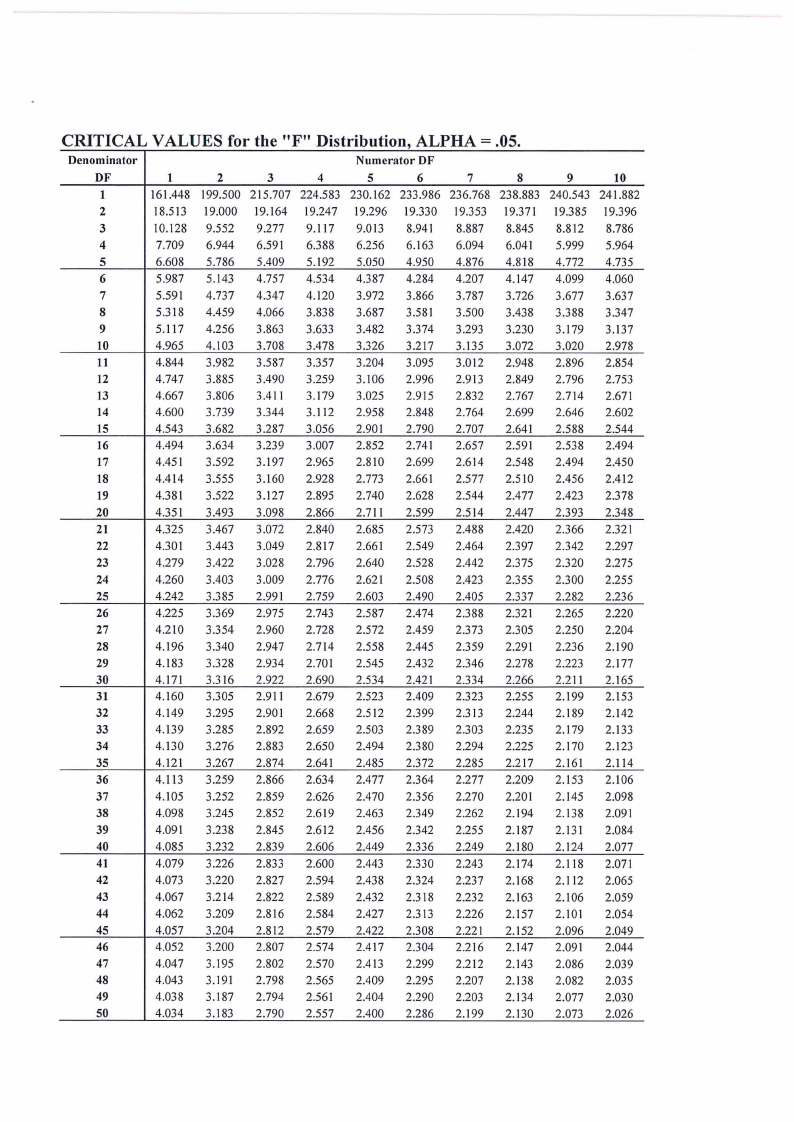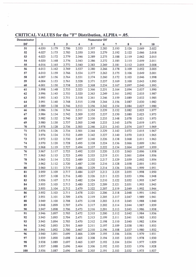 CRITICAL VALUES for the "F" Distribution, ALPHA= .05.
