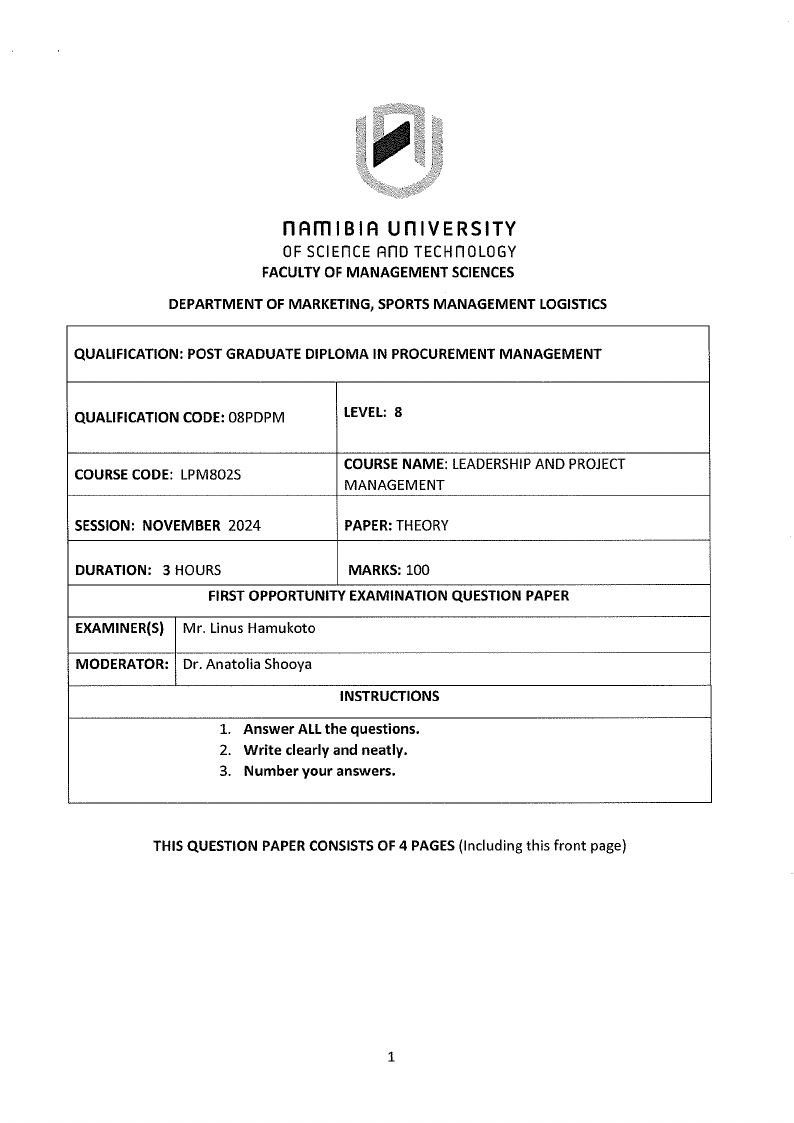 LPM802S - LEADERSHIP AND PROJECT MANAGEMENT - 1ST OPP - NOVEMBER 2024