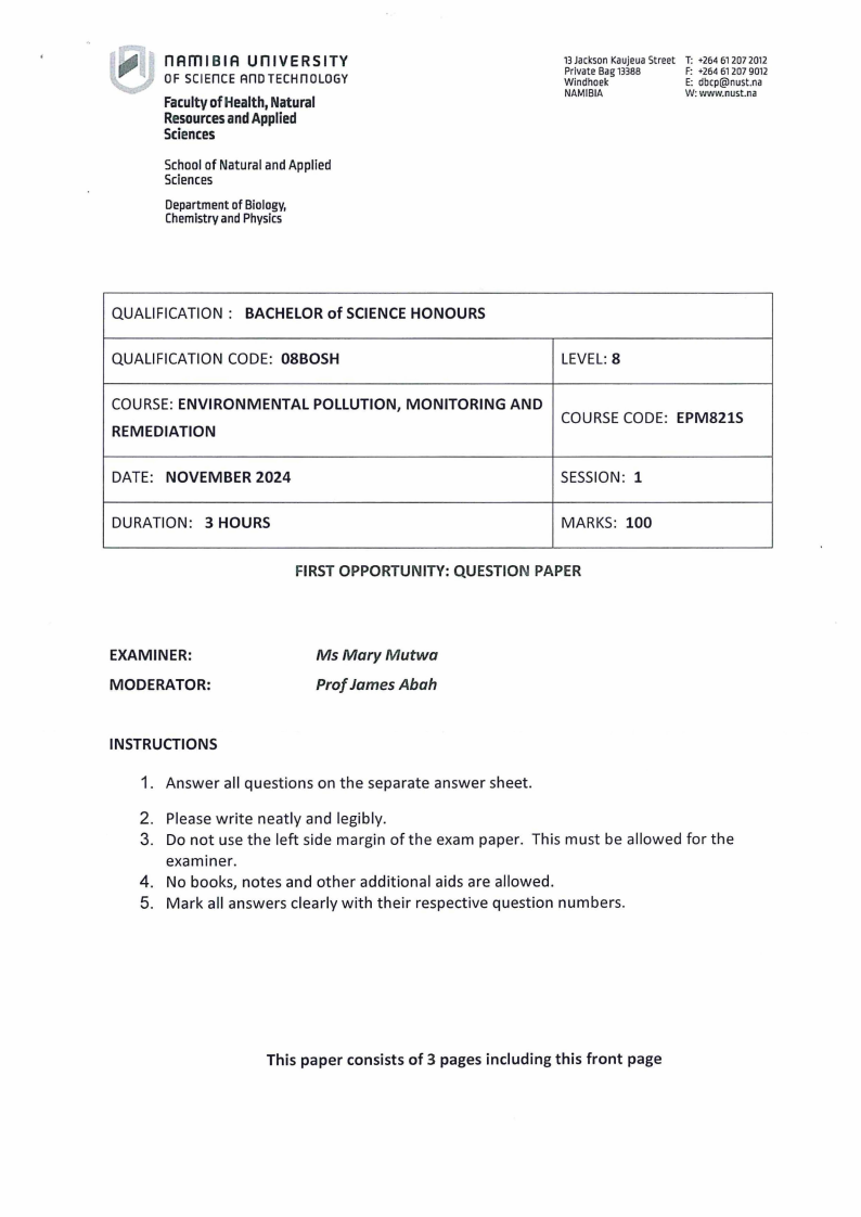 Environmental Pollution Monitoring And Remediation (EPM 821S) 1st Opportunity November 2024 2
